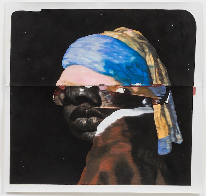 Nathaniel Mary Quinn, Erica with the Pearl Earring (detail), 2015, Black charcoal, gouache, soft pastel, oil pastel, oil paint, paint stick, and silver oil pastel on Coventry Vellum Paper, 25 1/2 x 25 1/2 inches (64.8 x 64.6 cm). Collection of Rhona Hoffman. © Nathaniel Mary Quinn. Courtesy the artist and Gagosian.